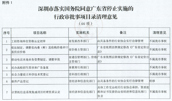 附件:1.深圳市落实国务院同意广东省停止实施的行政审批事项目录清理意见(66项)