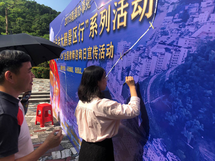 近日,大鹏新区南澳办事处司法所联合各社区在南澳法治公园举办以“法治•旅游”为主题的“法治大鹏景区行”系列宣传暨“8•26”全国律师咨询日宣传活动。大鹏新区政法办司法科领导、司法所所长、社区调解主任、工作人员、居民及游客纷纷在巨大的签名墙上签名留影、拍照留念,承诺“遵纪守法,从我做起”。