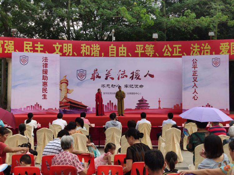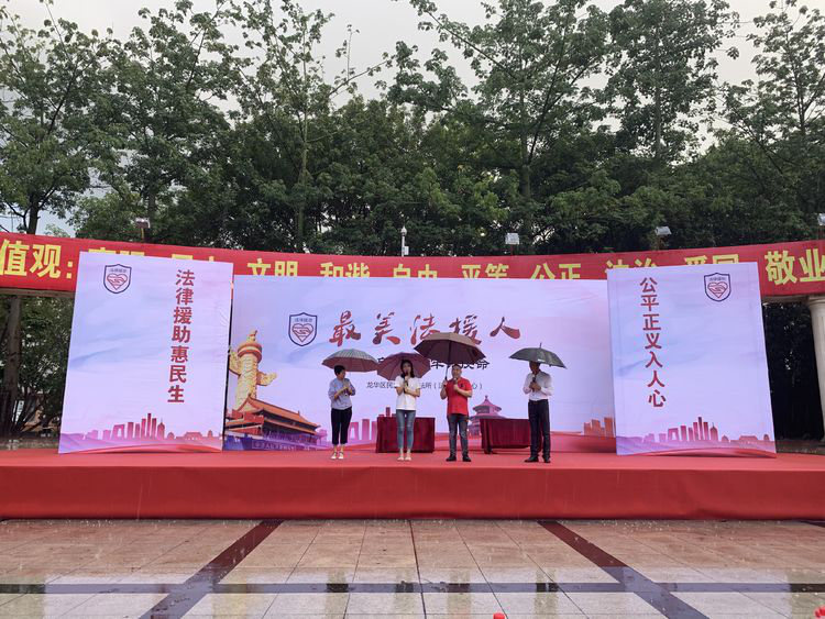 尽管当天天气酷热,活动中途还一度下起了阵雨,但这也挡不住群众的热情,活动在风雨中有条不紊地进行着,台上的演员们拿着雨伞在用心地表演,台下的工作人员在顶着风雨为群众送上宣传礼品。“不忘初心、牢记使命”,不仅仅是一句口号,它督促我们,在工作中要不畏困难险阻,始终坚守岗位,为人民服务,做“最美法援人”。