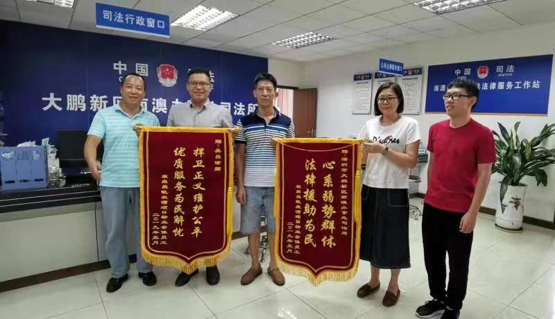 6月14日,在南澳办事处司法所公共法律服务大厅,受援人王某莉等21人选派的三名代表送来了一面写有“心系弱势群体,法律援助为民”和一面写有“捍卫正义维护公平,优质服务为民解忧”的锦旗,以表达对南澳司法所法援中心和吴昌律师为他们提供的法律援助服务由衷地感谢。