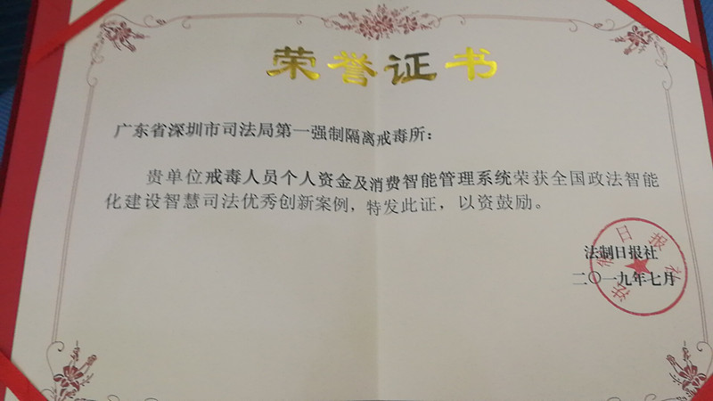 7月3日,由法制日报社、北京安全防范行业协会主办的“全国政法智能化建设研讨会、全国政法智能化建设技术装备及成果展”开幕。深圳市司法局第一强制隔离戒毒所(简称深圳一所)申报的“戒毒人员个人资金及消费智能管理系统”,荣获“2019全国政法智能化建设智慧司法优秀创新案例”,副所长赖国强同志代表该所领取荣誉证书。