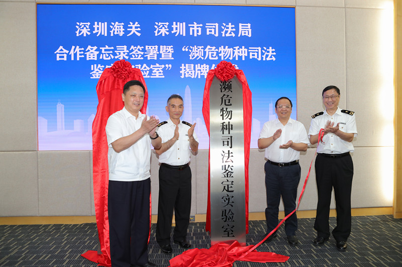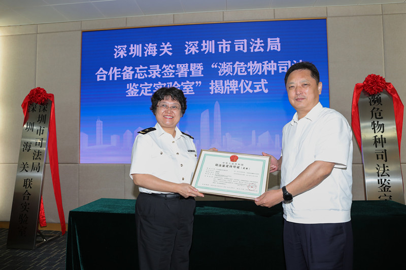 深圳海关关长陈小颖、深圳市司法局局长蒋溪林见证签字仪式,并为“深圳海关濒危物种司法鉴定实验室”揭牌。