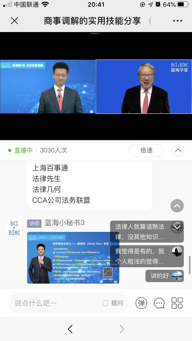 首场课程由“法律名人录”全球调解思想领袖杨洪均先生进行授课,他围绕“纠纷成因与纠纷解决的主要障碍”“从传统对立式谈判到以利益为基础的谈判技巧”“聆听的艺术与技巧”“调解程序与调解风格介绍”四个方面,结合讲师职业生涯及生活中的生动案例与丰富经验,通过场景化的讲解与互动,为大家在线讲解在线解读谈判与调解的技巧。区司法局充分发挥统筹能力,鼓励辖区人民调解员、社区法律顾问及律师、企业管理等人士积极参与课程培训,共计3030人次观看此次线上直播。