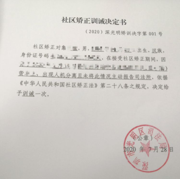 为贯彻执行《中华人民共和国社区矫正法》(以下简称《社区矫正法》),强化对社区矫正对象的监督管理,增强其矫正意识、身份意识,2020年7月28日下午,光明区司法局根据《社区矫正法》相关规定对出现违规行为的社区矫正对象王某进行训诫教育,并开出《社区矫正训诫决定书》,这是2020年7月1日《社区矫正法》实施以来,光明区司法局开出的首张训诫决定书。